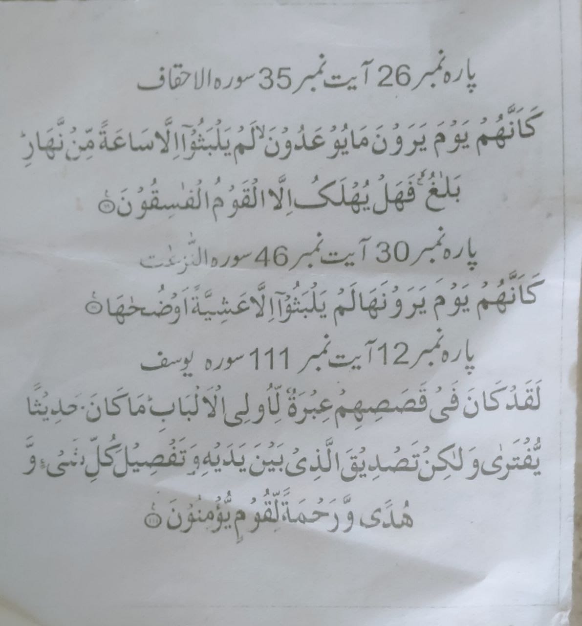 آٹا گوندھنے والی صاف مٹی کی کنالی(سانک) لے لیں۔ اس میں رات کو گیروں(پنسار سٹور سے مل جاتی ہیں )کے ساتھ اسی ترتیب کے ساتھ ان تین آیات کولکھ لیں اور اس میں پانی ڈال کر چھوڑ دیں اور ڈھانپ دیں صبح نہار منہ فجر کی نماز کے بعد پانی کو پی لیں اور اس میں پانی ڈال کر پھر دوبارہ ڈھانپ کر رکھ دیں اور اسی طرح عصر کی نماز کے بعد پانی کو پی لیں۔نو ماہ تک آپ نے یہ عمل جاری رکھنا ہے ایک دن بھی ناغہ نہیں کرنا اس میں